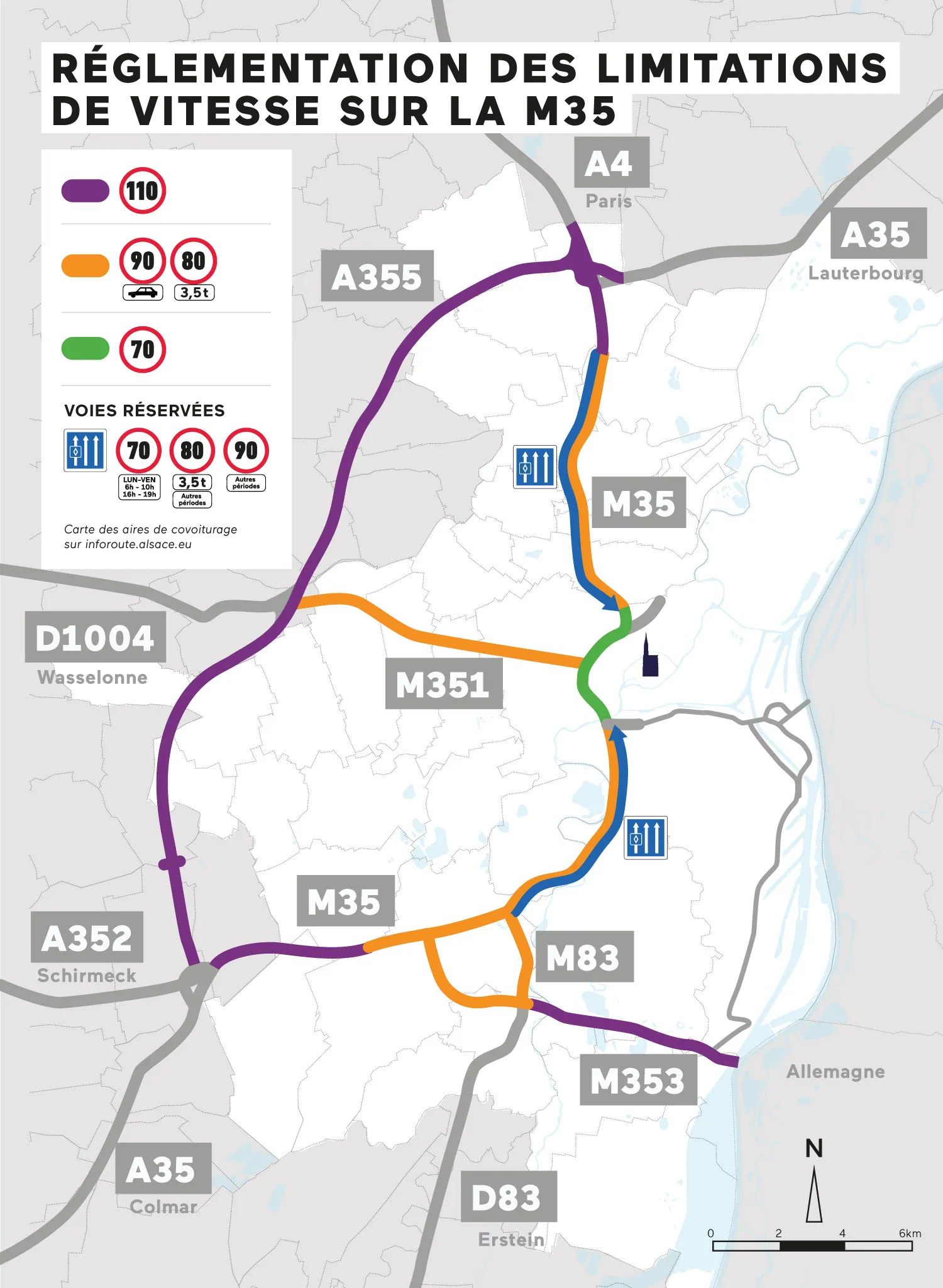 Une limitation à 70km/h sera également applicable sur le tronçon central de l'autoroute, entre la place de Haguenau et la Porte de Schirmeck.