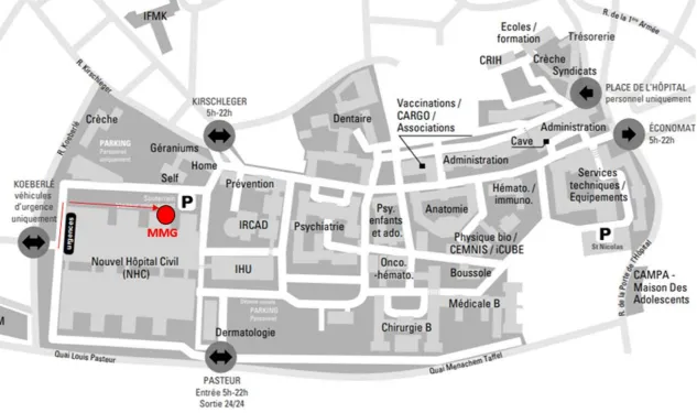 Ce lieu se situe à proximité des urgences du NHC ce qui facilite la réorientation de certains patients et la complémentarité des prises en charges.